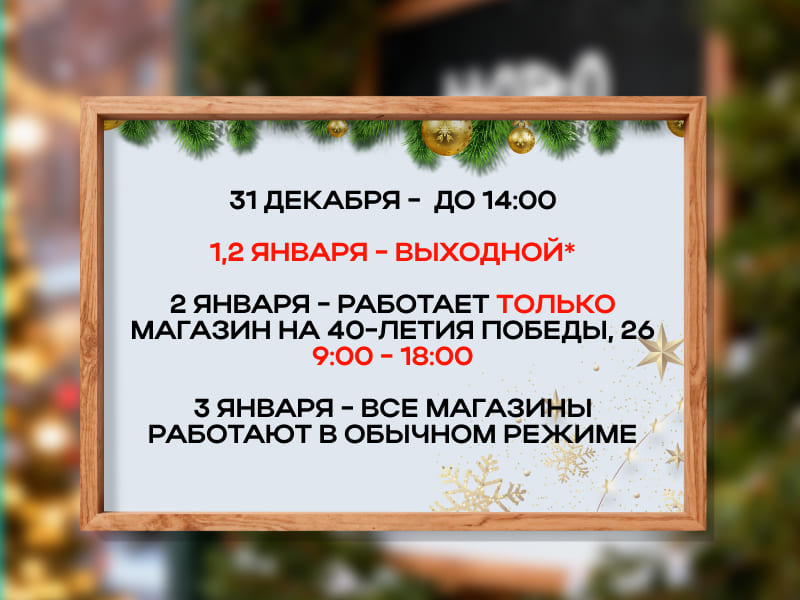 2 января 2026 года — с 9:00 до 18:00 работает только магазин по адресу: ул. 40-лет Победы, 26